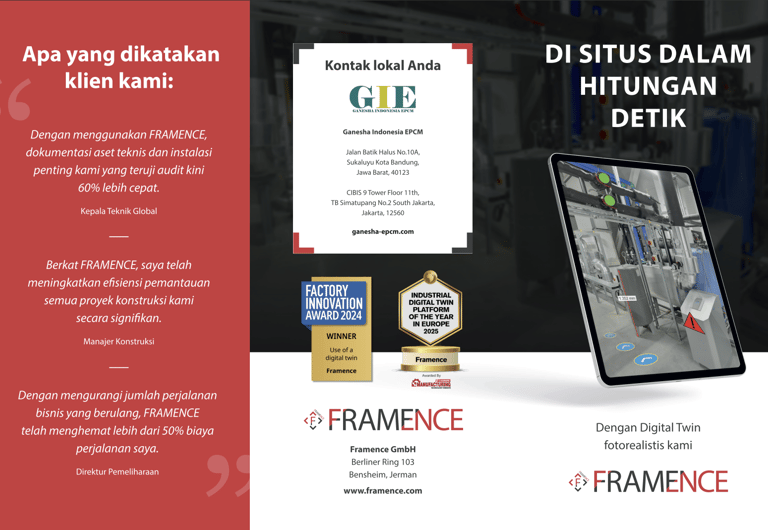PT Ganesha Indonesia EPCM is proud to announce a strategic collaboration with Framence, a leading German technology provider. This partnership is established to introduce and market cutting-edge Digital Twin services across Indonesia.